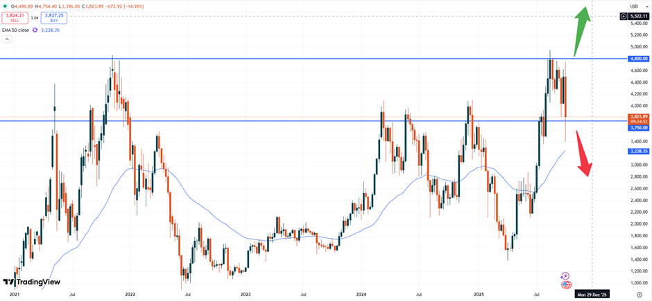 إذا كُسر مستوى الدعم القوي عند 3,750 دولارًا كما هو موضح في الرسم البياني الأسبوعي، فقد يضعف السوق أكثر، وقد يتراجع السعر إلى منطقة 3,000 دولار أو حتى أدنى من ذلك. أما في حال صمود الدعم، فقد نشهد ارتدادًا فنيًا قصير المدى قبل استئناف الاتجاه العام.
