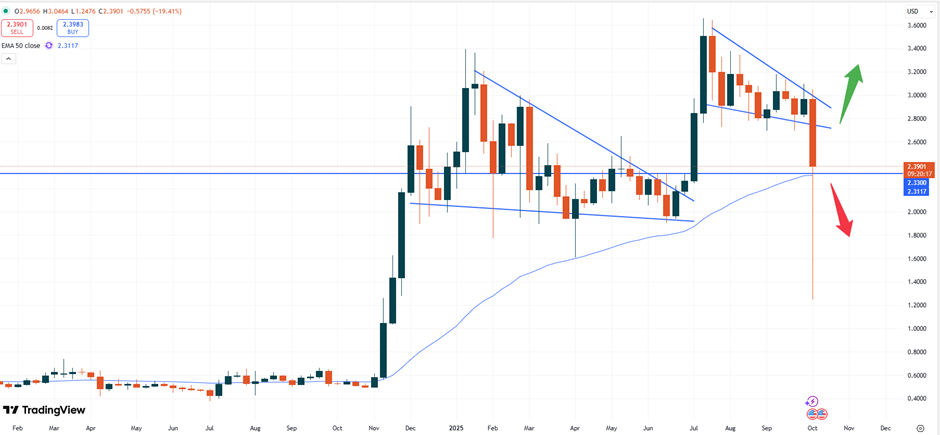 – ريبل (XRP):يتم تداول ريبل حالياً عند 2.3900 دولاراً أمريكياً. ويُعد الأضعف أداءً بين جميع العملات الرقمية المذكورة اليوم. فبعد تصريحات الرئيس الأمريكي ترامب، تراجعت العملة بسرعة نحو مستوى 1.3000 دولار أمريكي، في ما يُعرف بـ الهبوط المفاجئ (Flash Drop). الصفقات ذات الرافعة المالية العالية كانت من أبرز أسباب هذا الانخفاض، إذ اضطر العديد من المتداولين عديمي الخبرة إلى إغلاق مراكزهم لتفادي الخسائر، بينما قامت بعض منصات التداول بعمليات إغلاق تلقائي للمراكز عالية الرافعة لحماية عملائها من الخسائر المفرطة.