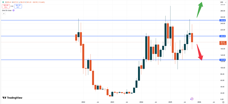 يُظهر نموذج الشمعة “البين بار” الهابطة الذي تكوّن في سبتمبر إشارة تحذير واضحة للمتداولين، بأن الأسعار قد تتجه نحو الهبوط. ولذلك، فإن الهبوط الحالي دون مستوى 200.00 دولار أمريكي يُشير إلى أن المزاج الإيجابي قد تراجع مؤقتًا. في المرحلة الحالية، يجب على المتداولين التركيز على حركة السعر بدقة. ففي حال استقرار السعر فوق مستوى 150.00 دولار أمريكي، قد يستعيد السوق زخمه مجددًا ويبدأ مرحلة صعود جديدة. أما إذا فشل في الحفاظ على هذا المستوى، فقد يشهد السوق موجة تصحيح أعمق خلال الفترة القادمة.