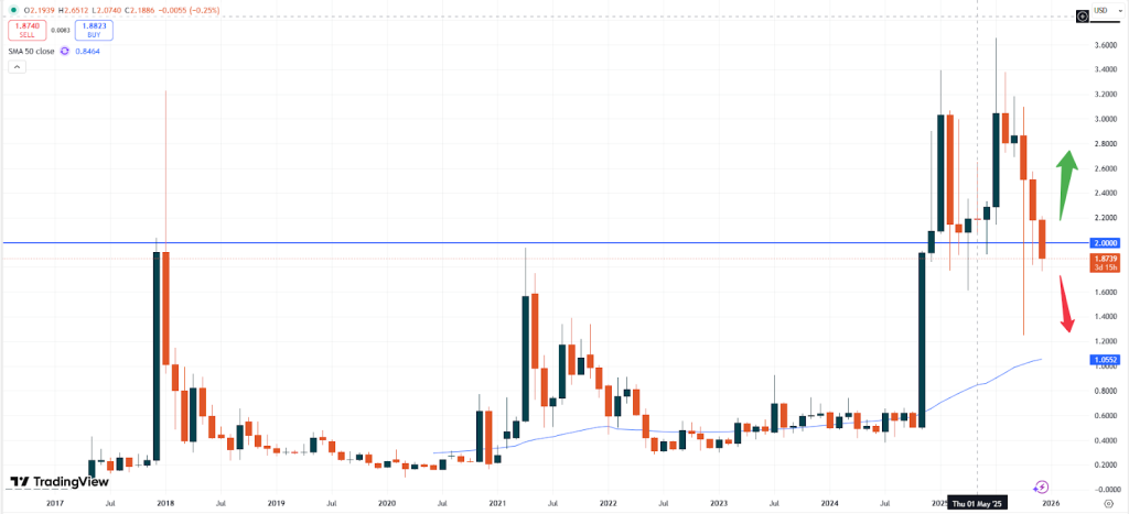 – ريبل (XRP): يتم تداول عملة ريبل حاليًا عند مستوى 1.8739 دولار. وقد تراجع السعر مجددًا دون المستوى النفسي البالغ 2.0000 دولار، ما قد يدفع السوق إلى مواصلة الانخفاض. وتجدر الإشارة إلى أن العملة تتداول حاليًا دون منطقة دعم فنية تعود إلى ديسمبر 2017، وهو ما قد يعكس استمرار الزخم السلبي.