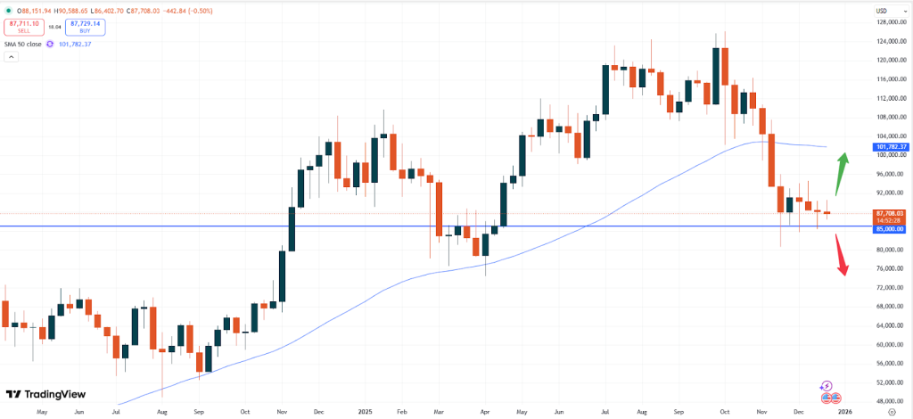 – بيتكوين (BTC): يتم تداول عملة بيتكوين حاليًا عند مستوى 87,708 دولار أمريكي. ويواصل السوق تحركه العرضي ضمن نطاق ضيق، حيث يُظهر الرسم البياني الأسبوعي غياب أي اختراق واضح صعودًا أو هبوطًا من منطقة 90,000 دولار. ومع بقاء الزخم الصاعد محدودًا، لا تبدو أيضًا مؤشرات على تسارع هبوطي في الوقت الراهن. وبناءً عليه، قد يحافظ السعر على استقراره عند المستويات الحالية ما لم يتم كسر مستوى الدعم الرئيسي عند 82,000 دولار.