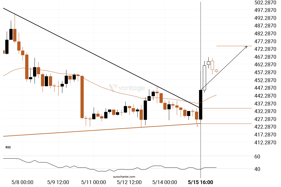BCHUSD has broken through a resistance line of a Triangle chart pattern. If this breakout holds true, we may see the price of BCHUSD testing 473.8895 within the next 2 days. But don’t be so quick to trade, it has tested this line in the past, so you should confirm the breakout before taking any action.