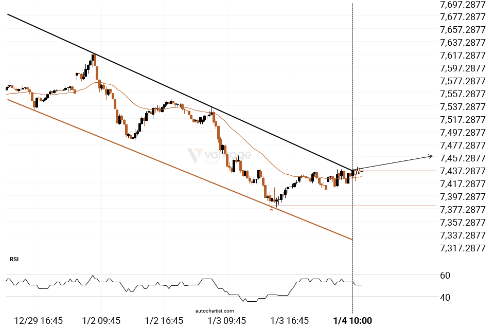 Channel Down pattern identified on CAC40 has broken through a resistance level with the price momentum continuing to move in an upward direction. A solid trading opportunity continues with the price expected to reach 7458.7981 in the next 10.