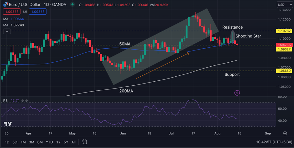 After forming a high at $1.12412 on around 18th July 2023, the price is now at a level of $1.09327 and has recently formed a shooting star candle showing the market has more bears than bulls. However, the market is bullish until the major low level of $1.08365 is breached below, forming consecutive lower highs and lows.