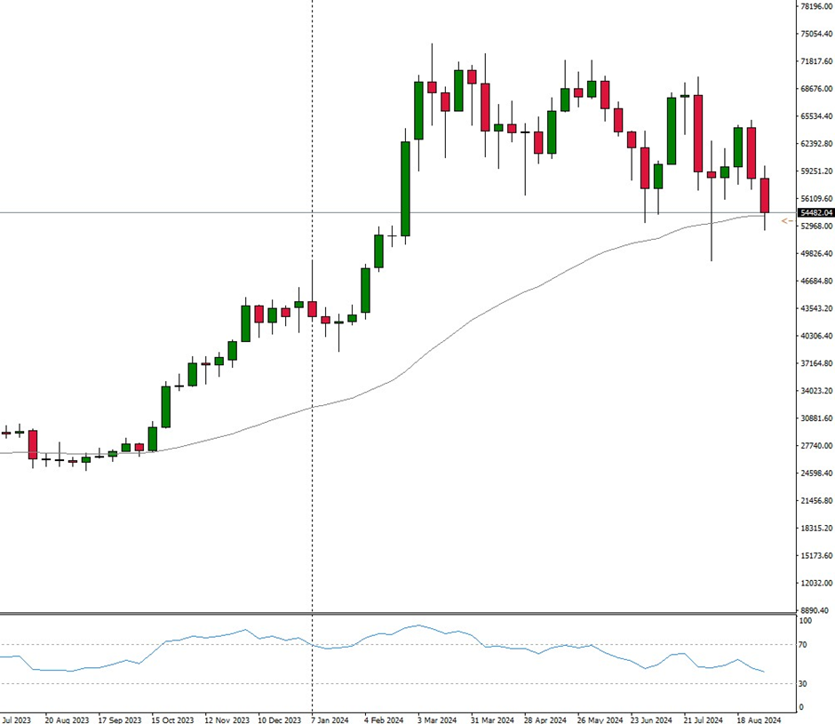 – BTC: Bitcoin is trading at USD 54,440. The weekly chart shows directly that the market had continued to move downwards and was initially able to catch up at the 50- moving average last week.