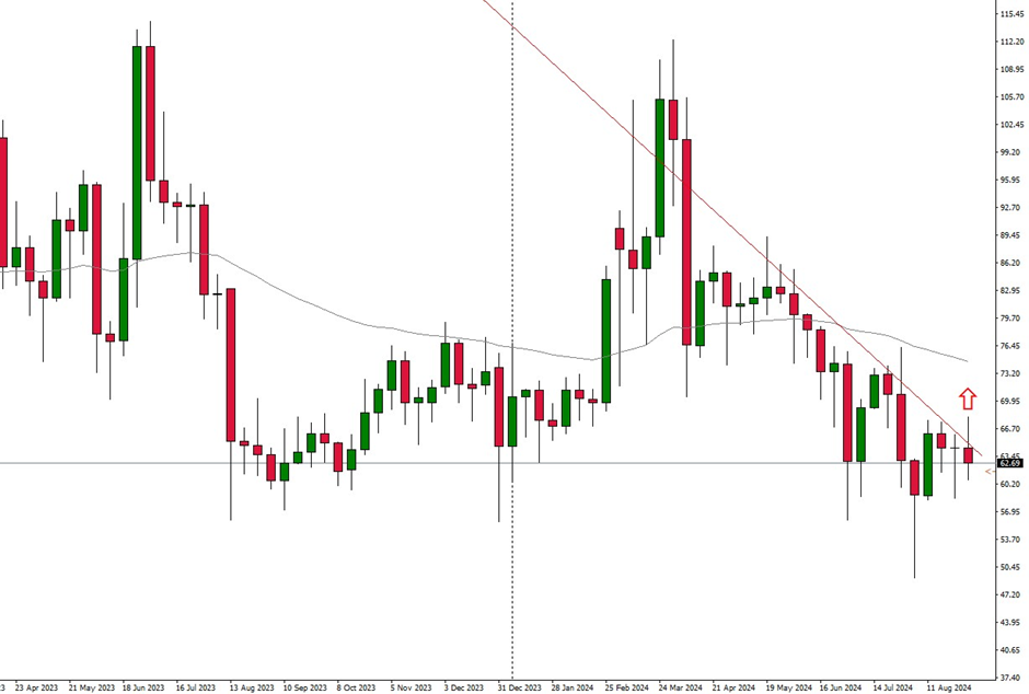 – LTC: Litecoin is trading at USD 63.55. Litecoin also tried to take a chance to break out to the upside last week, but failed to do so. The market briefly broke through the USD 65.00 area, but then had to settle below the falling trend line again.