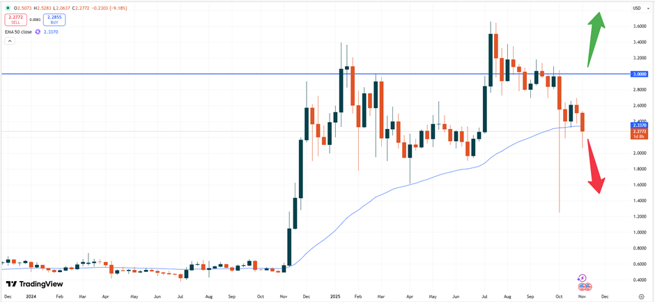 It is now important that the token can climb back up above the USD 2.50 price level. At that zone the 50- moving average will also start to act as support again. Furthermore, above the psychological level of USD 3.00 more upside momentum might even follow. This will be the zone above the recent candlestick with the long wick to the downside. A break above might then offer fresh buying activity.