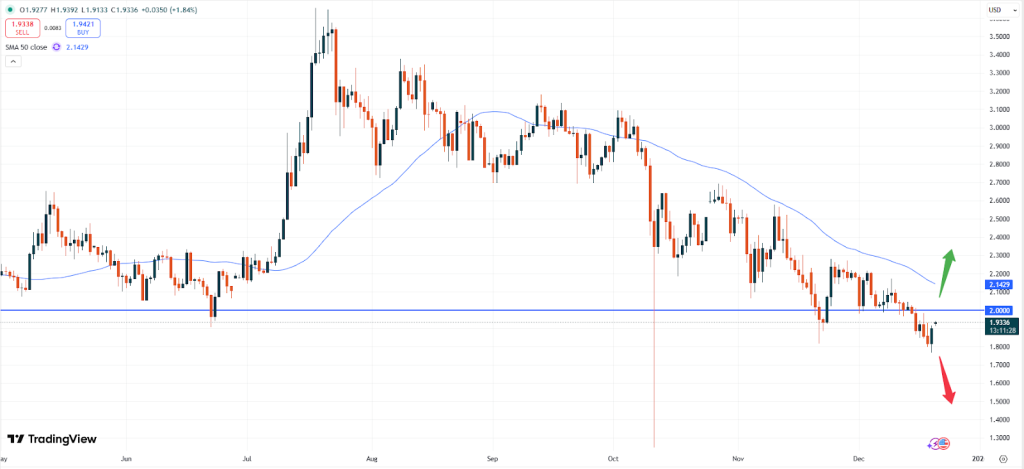 XRP – Ripple is currently trading at USD 1.9336. With the break of the psychological support level of USD 2.0000 the slide in prices seems to continue. Currently, though, the market seems to stabilize as last week’s green candlesticks indicate that fresh upside momentum could gear up steam.
