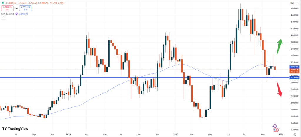 ETH – Ethereum is currently trading at USD 2,988. The market has traded in a sideways zone for the past five weeks without offering a clear direction. The pressure of more downside momentum has eased recently, as the market has stabilized. Yet, also fresh upside momentum seems to reman limited with the technical pinbar candlestick pattern, inhibiting the price from rising beyond the USD 3,450 price level.