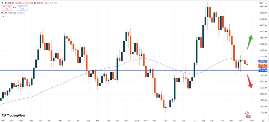 – ETH: Ethereum is currently trading at USD 2,939. Similarly to Bitcoin also Ethereum keeps trading in a sideways pattern. Any attempt of a breakout to the upside has been fading again pushing prices lower again. Only a push above the psychological USD 3,000 level might unleash fresh buying power.