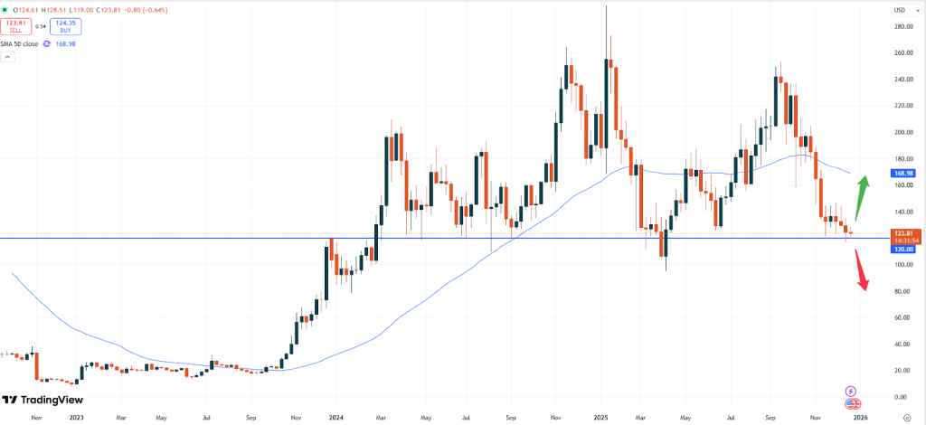– SOL: Solana is currently trading at USD 123.81. The market currently trades at the important support level of USD 120.00. A break lower might indicate a further slide in prices. The current zone supported the market several times, all the way back to March 2024.