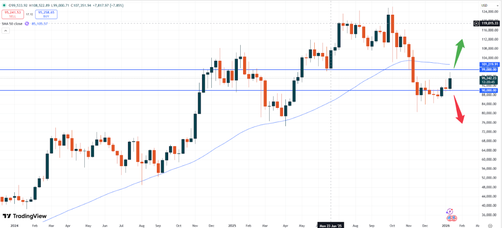 – BTC: Bitcoin is trading at USD 95,242. Since the market has been able to defend the technical and psychological support zone of USD 90,000 more upside momentum might be seen. As the weekly chart below shows, the market is not far away from the 50- moving average area. That zone could be the next target if Bitcoin is able to rise again.
