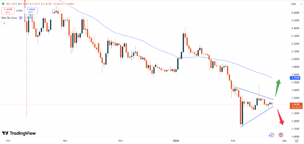 XRP – Ripple is currently trading at USD 1.4158. Similarly to the other coins also XRP is trading in a triangle pattern, which can be observed well based on the daily chart. A breakout seems to be on the cards anytime soon.