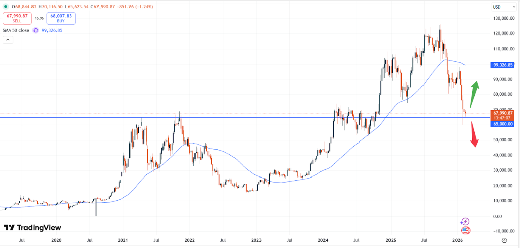 The crypto market in general remains in a negative pattern and no signs currently emerge, that it might start moving higher for now. With Bitcoin currently forming a triangle pattern, potentially leading to a breakout, market participants also focus on social media data. The words “Bitcoin to zero” have been searched for countless times in the US recently according to Google data and even hit an all- time- high. Yet, such moves have also peaked in the past. In particular between 2021 and 2022 the market then led to a bottom being able to rise from there. Currently, geopolitical tensions are flaring up as well. The tensions in regards to Iran and the news around US tariffs have added an array of negative headlines market still need to digest.