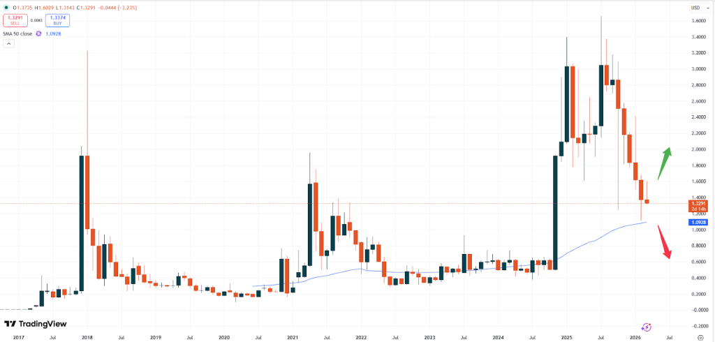 Given the 50- moving average zone being in sight at USD 1.0928 the market might find some support if the pressure to the downside will continue. A rise in prices of bigger magnitude might only follow if the token is able to break above the USD 1,5000 level. Until then traders should focus on the important support zone between 1.2000 and 1.0000 to find potential entries to the upside.