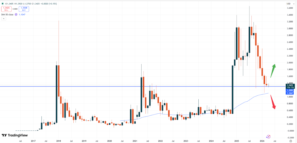 – XRP: Ripple is trading at USD 1.3425. The price looks still set to weaken further based on the monthly chart below.