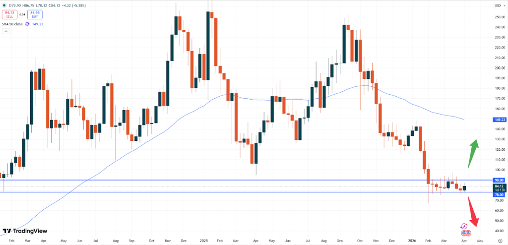 If the market is not able to push beyond that zone the sideways pattern might continue and eventually push Solana lower again. Especially the break of the USD 78.00 level might then increase the selling pressure again.