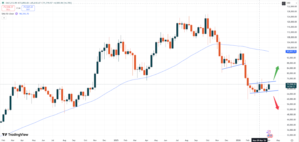 Should a break above the level occur, BTC might move towards the USD 80,000 level. At that range the next technical resistance level can be found. A break below the current support level would cause the market to fall further.