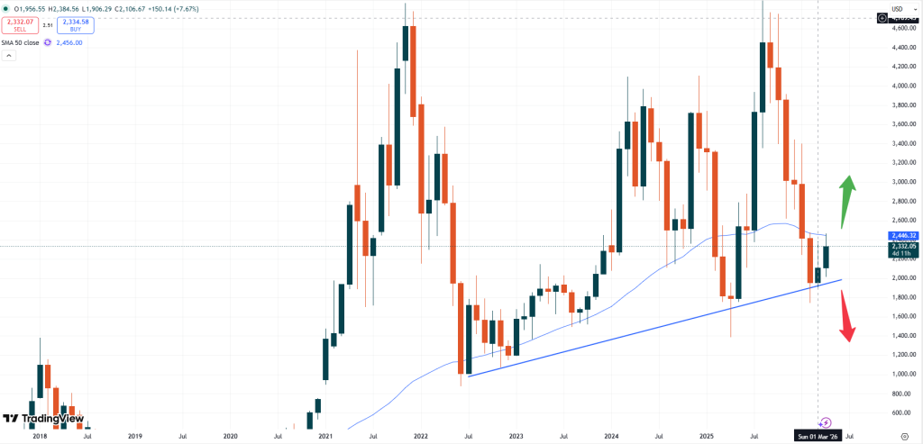 ETH – Ethereum is currently trading at USD 2,332. The price broke away from the recent suport level of USD 2,000 and keeps moving to the upside.