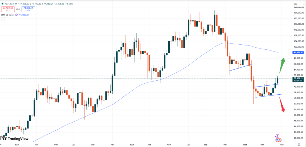 BTC – Bitcoin is trading at USD 77,989. The price of the token has broken away from the recent sideways trend and ever since keeps marching higher. The positive momentum remains rather limited as the market is now approaching a technical resistance level. The current zone at USD 79,000 has been a support zone in April 2025 and might hence now offer some headwinds.