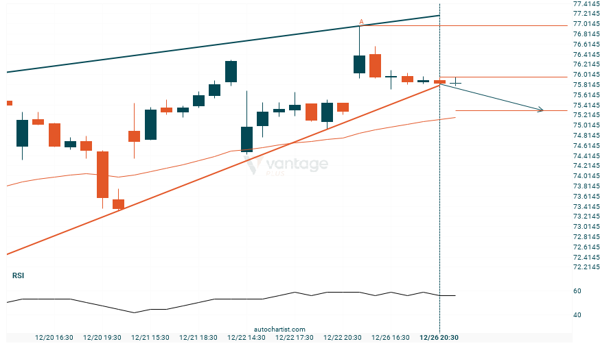 El Alibaba ha atravesado la línea de soporte, que ya se ha probado dos veces en el pasado. Hemos visto, anteriormente, un retroceso desde esta posición, así que debemos esperar la confirmación de la ruptura antes de operar. Si esta nueva tendencia persiste, un nivel objetivo alrededor de 75.3005 podría materializarse dentro de las próximas 7 horas.