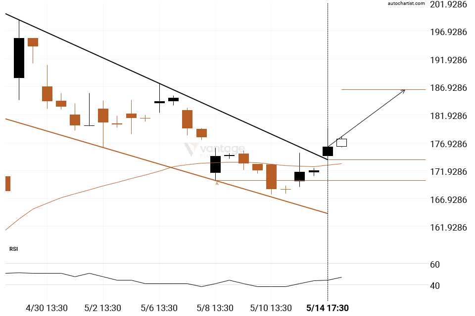 Tesla has broken through the resistance line which it has tested twice in the past. We have seen it retrace from this line before, so one should wait for confirmation of the breakout before trading. If this new trend persists, a target level of around 186.4293 may materialize within the next 23 hours.