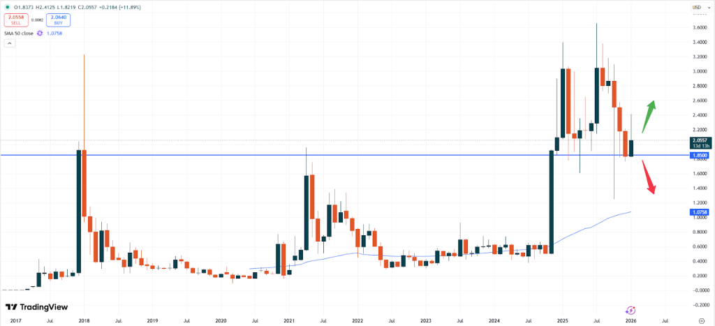 Der obige Monats-Chart zeigt, dass die positive Dynamik weiter nachlässt. Händler sollten auf das Unterstützungsniveau bei 1,8500 USD achten. Sollte diese Zone durchbrochen werden, könnte es zu einer weiteren Abwärtsdynamik kommen. Umgekehrt könnte ein Durchbrechen der psychologischen Preisgrenze von 2,5000 USD auf eine positive Dynamik hindeuten.