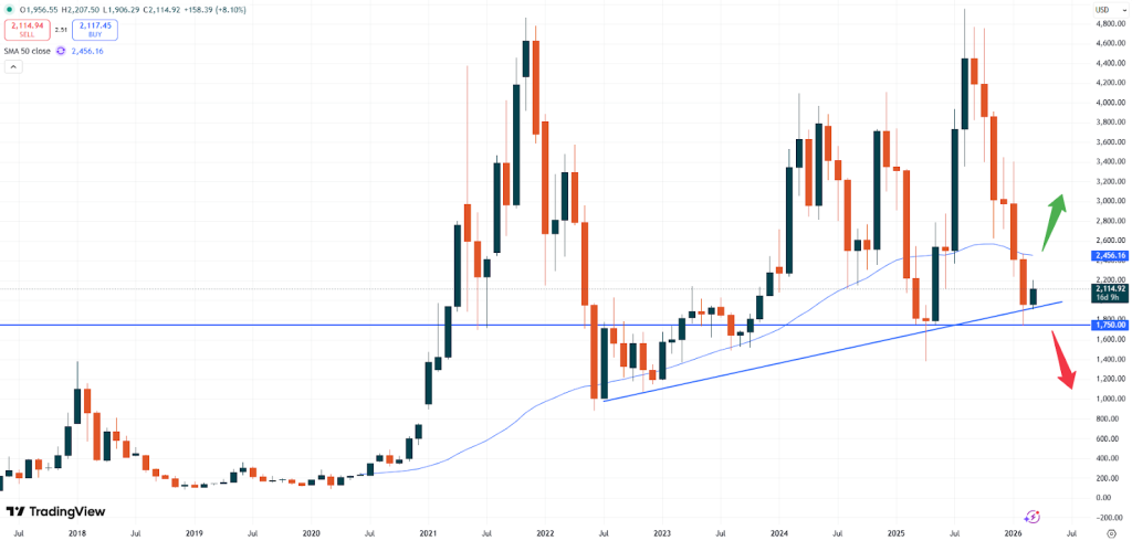 – ETH: El Ethereum cotiza a 2.114 dólares. Además, el ETH sigue cotizando en niveles elevados en lo que va de mes. El precio parece estar defendiendo la importante zona de soporte de 1.750 dólares, que resulta crucial para la evolución futura del mercado. Una ruptura de esta zona podría provocar una caída del precio, mientras que una ruptura de la media móvil de 50 días, situada en 2.456 dólares, podría desencadenar un nuevo impulso alcista.