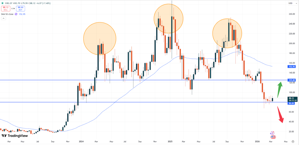 Si se rompe el nivel de soporte crítico de 80,00 USD, el mercado bajará, dado el sentimiento bajista. A menos que se produzca esta caída, tal vez convenga a los operadores buscar un impulso alcista hacia la siguiente zona de resistencia de 105,00 USD.
