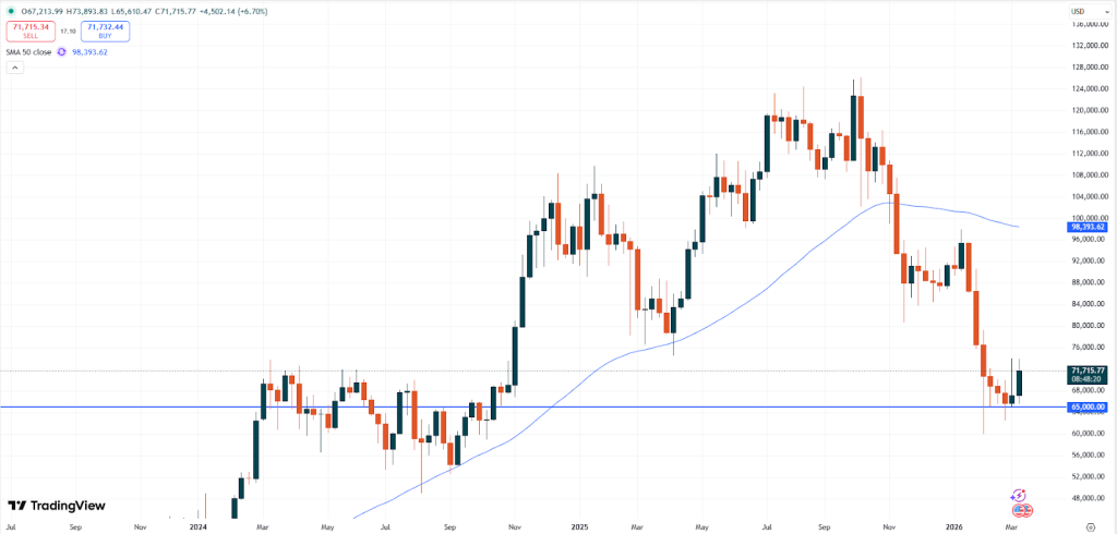 El bitcoin se desplomó alrededor de un 8,5% cuando comenzó la guerra con Irán un sábado. Dos semanas después, el BTC ha superado en rendimiento a casi cualquier otro activo y ha subido alrededor de un 10%. Estos movimientos fueron mejores que los del S&P 500 y el oro. Solo los precios del petróleo y el dólar habían tenido un mejor rendimiento en este contexto.