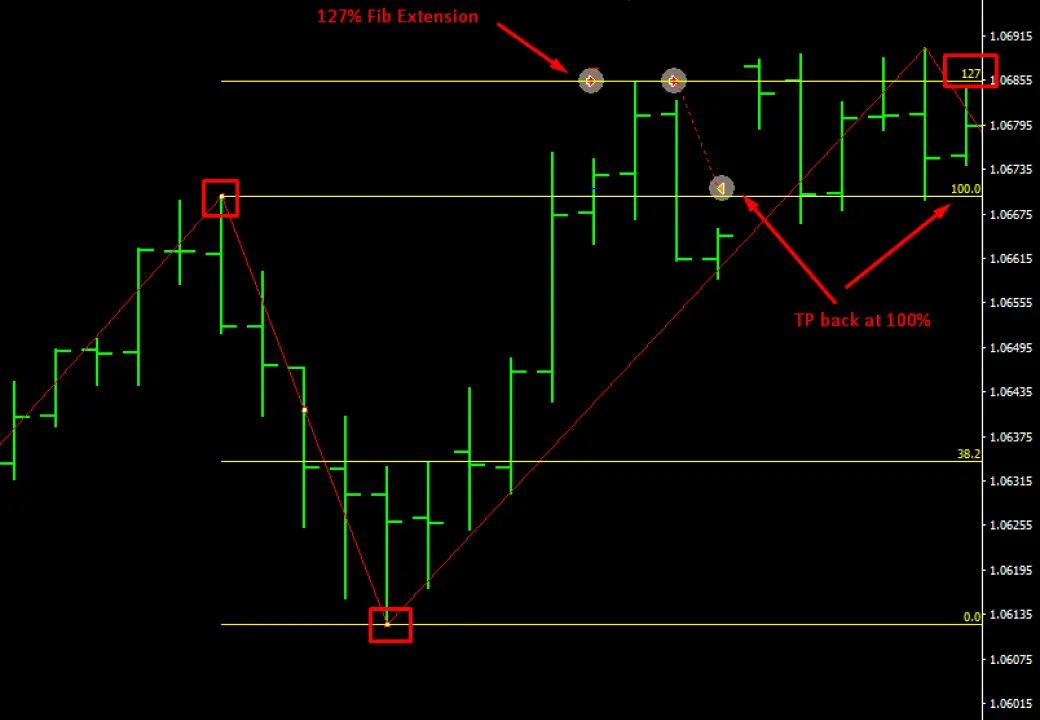 AutoFibo EA on tuvastanud tehingu 127% Fibonacci taandumise tasemel ja teinud vastupidise tehingu, et kapitaliseerida liikumine tagasi alla 102% tasemele.