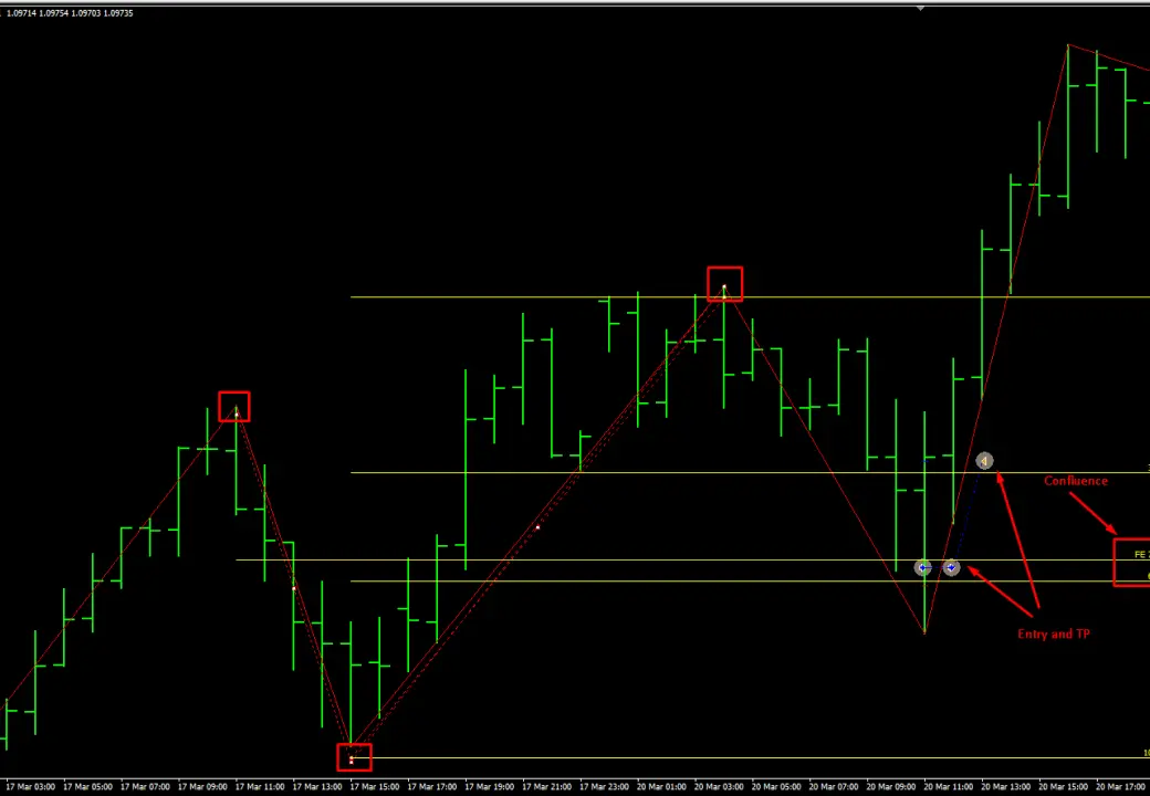 Toimus Fibonacci kokkulangevuse ajal (koht kus rohkem kui üks Fibonacci tüüp joonduvad). Näeme, et 61.8% Fibonacci taandumine sobib hästi kokku 78.6% Fibonacci laienemisega 5% tolerantsivahemikus. Seejärel sisestame tehingu, mille kasumivõtu tase on määratud 38,2% Fibonacci tagasitõmbumise juurde