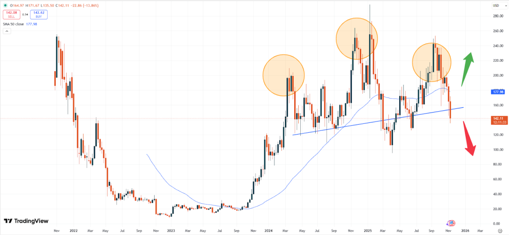 – SOL: Solana se négocie à 142,05 USD. Sur la base de la tendance technique des prix, le marché semble prêt à s’affaiblir davantage.