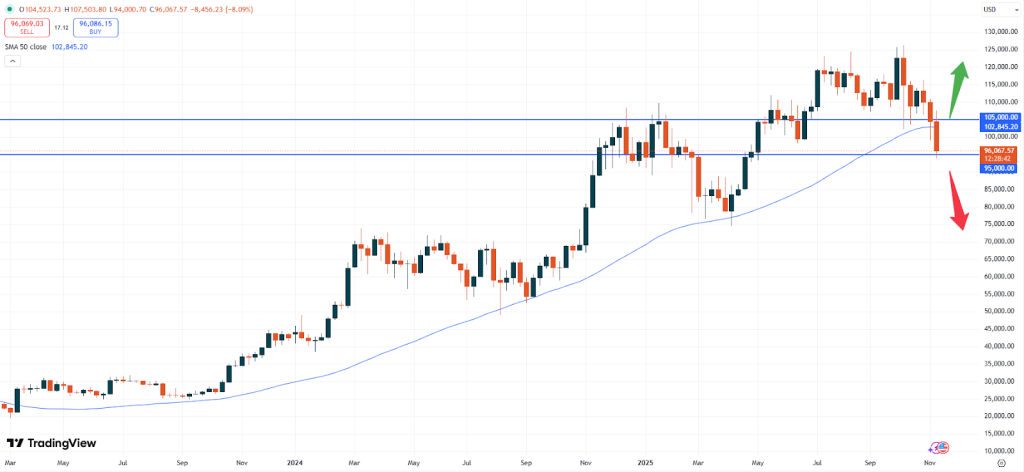 – BTC: Le Bitcoin se négocie à 96.070 USD. Le marché a franchi à la baisse l’importante zone de résistance psychologique des 100.000 USD. Cela seul pourrait éloigner les traders et finir par entraîner un retournement baissier de la tendance.